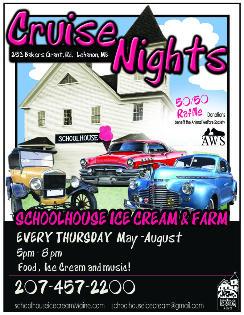 Cruise night at School House Ice Cream and Farm Every Thursday 5PM-8PM… Food Ice Cream and Music
