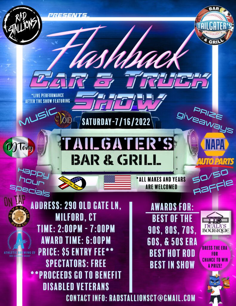 Awards will be given at 6pm 50/50 raffle Show car/trucks: $5 per vehicle cash only. Spectators: Free Happy hour specials for attendees. Music by DJ Tony **Live music by The Void after the show** Awards will be given to: Best of the 90s era Best of the 80s era Best of the 70s era Best of the 60s era Best of the 50s era Best Hot Rod (1940s & older) Best Car in Show (All years) Awards will be also given to those who dress the part of an era. All make and model cars and trucks are welcome to join the event.