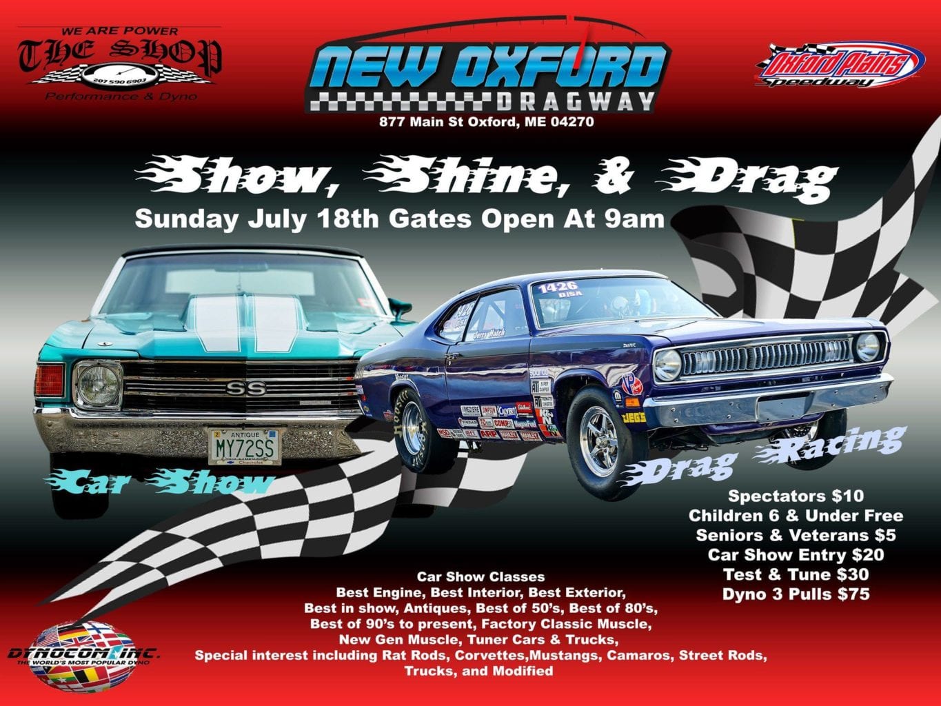 Annual Show, Shine, & Drag! Brought to you you by New Oxford Dragway, Oxford Plains Speedway, & The Shop Performance & Dyno.