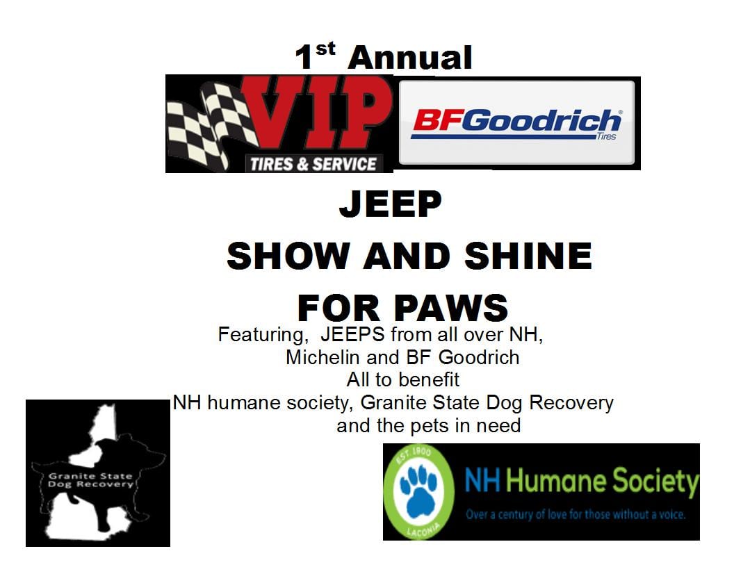 BRING YOUR JEEPS TO SHOW OFF FOR THE COMMUNITY, ENTER RAFFLES FOR GREAT PRIZES, FLEX OUT YOUR JEEP ON OUR RAMP, MEET N GREET WITH DOGS FROM NH HUMANE SOCIETY, ALL PROCEEDS AND DONATIONS WILL BE SPLIT BETWEEN GRANITE STATE DOG RECOVERY AND NH HUMANE SOCIETY LACONIA.