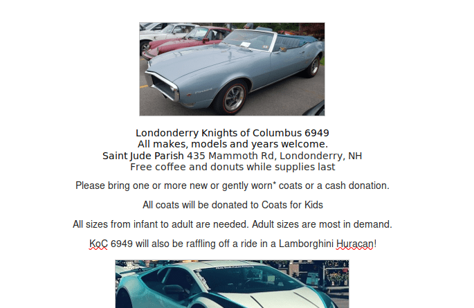 Read MoreA Coats for Kids Event October 8th, 8am to 11am Londonderry Knights of Columbus 6949 All makes, models and years