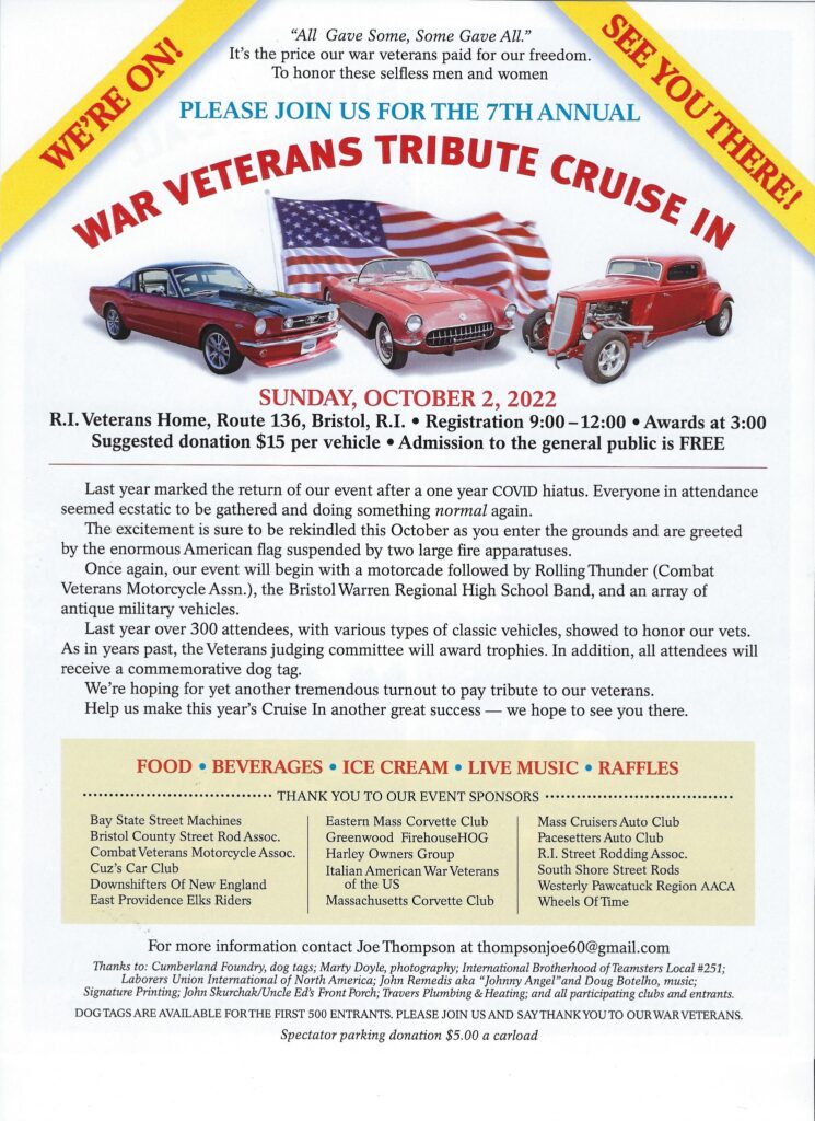 The 7th Annual War Veterans Tribute Cruise-In is this Sunday October 2 at the Rhode Island Veterans Home in Bristol, R.I. (Rte. 136) with registration from 9 AM – Noon with the Veterans award ceremonies at 3 PM.